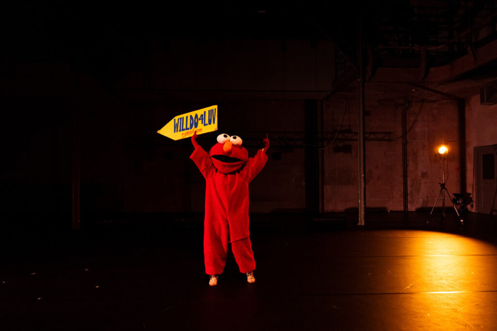 Sharkey trägt zu diesem Zeitpunkt ein Ganzkörperplüschkostüm einer roten, kulleraugigen, knollennasigen, dauerlachenden Figur, wie sie in der Sesamstraße mitspielen könnte, führt darin allerlei Faxen auf, tanzt, breakdanct, klatscht mit dem Publikum ab, winkt, als wäre er/sie Mickey Mouse und würde in Disneyland arbeiten, spielt mit einem Schild, auf dem „Open 4 Collaborations“ steht.