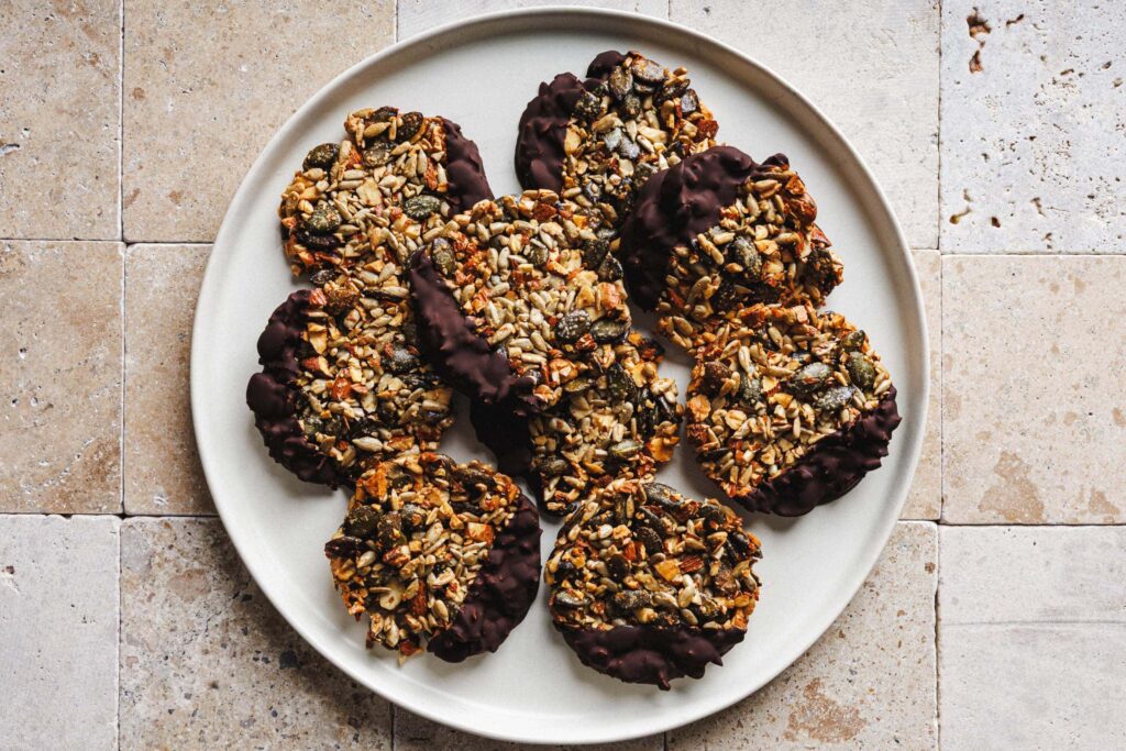 Sobald die Schokolade im Wasserbad geschmolzen ist, können die kurz abgekühlten Nussplätzchen hineingedippt werden. Das Trocknen dauert dann gerade fünf bis zehn Minuten. Wenn du es also darauf anlegst, ist die gesündere, leckere und hübsche Adventsnascherei bereits nach etwa dreißig Minuten fertig.