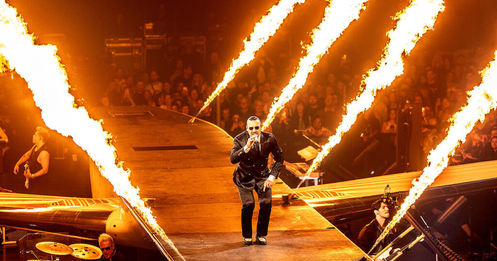 Im Autotune-Aufwind flog dann sprichwörtlich das Dach weg – nämlich das vom Flieger. Die Decke des Jets hob und senkte sich, der ehemalige Passagierraum wurde zur Bühne. Als Zuschauer wusste man kaum, wo man zuerst hinschauen sollte: Zum Star, der im eleganten Anzug auf dem Seitenruder balancierte („Loser“)? Ins Feuergewitter oder auf die rauchenden Turbinen bei „Fühlst du das auch“? Oder auf das Lichtermeer der tausenden LED-Armbänder im Publikum?
