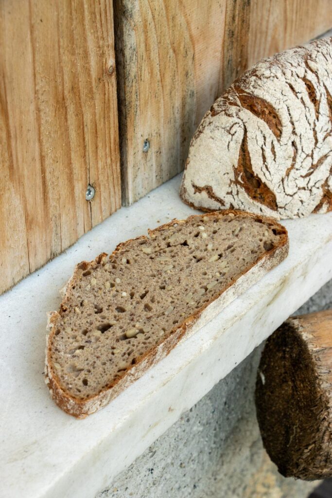 Das Rezept arbeitet mit einem Roggenpoolish und einem Salzsauerteig, der den Teig überwiegend lockert. Das Brot ist mild im Geschmack und durch die Saaten nussig. Der Teig kann auch gut im Kasten gebacken werden.