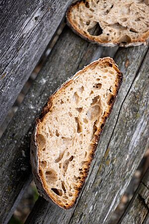 Diese Porung mit alten Dinkelsorten zu erreichen, die wir zur Verfügung hatten, würde schwierig werden. Deshalb haben wir das Rezept mit Weizen entwickelt. Es ist bis auf eine homöopathische Menge Hefe nur mit Sauerteig gelockert und super saftig. Ein Genuss!