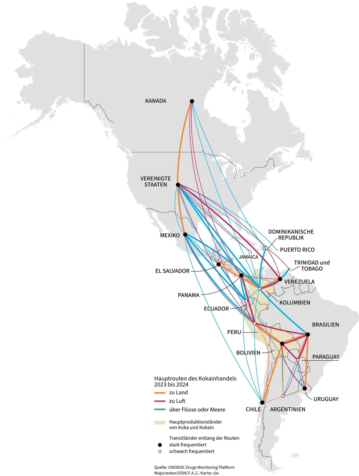 Sicherer werden die USA dadurch nicht. Wenn Trump von „Massenvernichtungswaffen“ spricht, bezieht er sich ohnehin nicht auf kolumbianisches Kokain, sondern auf Fentanyl. Das synthetische Opiat war in den vergangenen Jahren tatsächlich für den Tod von Hunderttausenden Konsumenten in den USA verantwortlich und damit die häufigste Todesursache für Amerikaner unter 50 Jahren. Keines der Boote, die in den vergangenen Monaten in der Karibik oder im Pazifik versenkt wurden, hatte jedoch Fentanyl geladen. Und auch das aus korrupten venezolanischen Beamten bestehende „Cartel de los Soles“ dürfte von dem extrem abhängig machenden Opiat nur aus den Nachrichten erfahren haben.