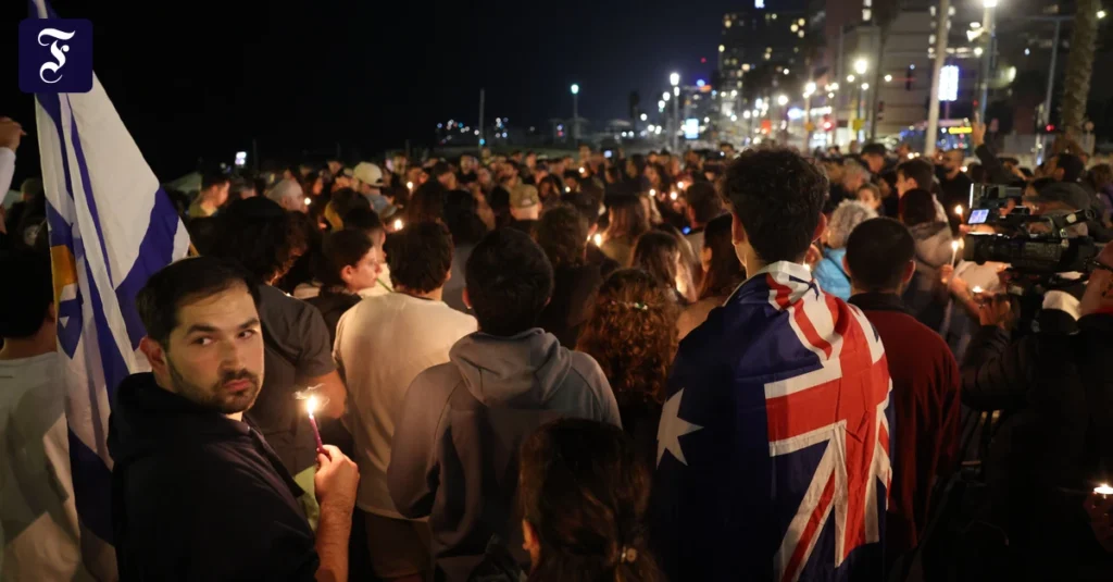 Die Bestürzung über den antisemitischen Angriff, bei dem die Attentäter mindestens 15 Menschen getötet und zahlreiche weitere verletzt haben, ist groß. Am Abend kommen an der Strandpromenade in Tel Aviv mehrere Hundert Menschen zusammen, um gemeinsam der Opfer zu gedenken. Viele australische Israelis sind darunter, aber auch andere, die ihre Solidarität bekunden wollen. Aus kleinen Teelichtern formen sie auf dem Boden einen Davidstern, singen und beten gemeinsam, halten eine Schweigeminute ab.
