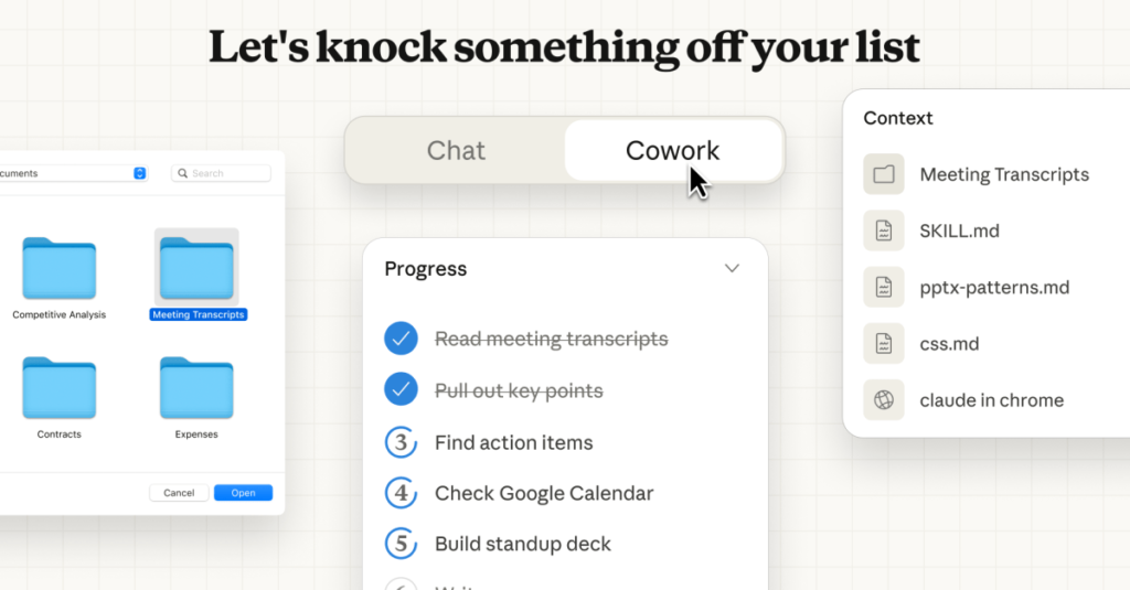 Anthropic’s “Skills for Claude,” announced in October, was a partial precursor to Cowork. Starting in October, Claude could improve at personalized tasks and jobs, by way of “folders that include instructions, scripts, and resources that Claude can load when needed to make it smarter at specific work tasks — from working with Excel [to] following your organization’s brand guidelines,” per a release at the time. People could also build their own Skills for Claude relative to their specific jobs and tasks they needed to be completed.