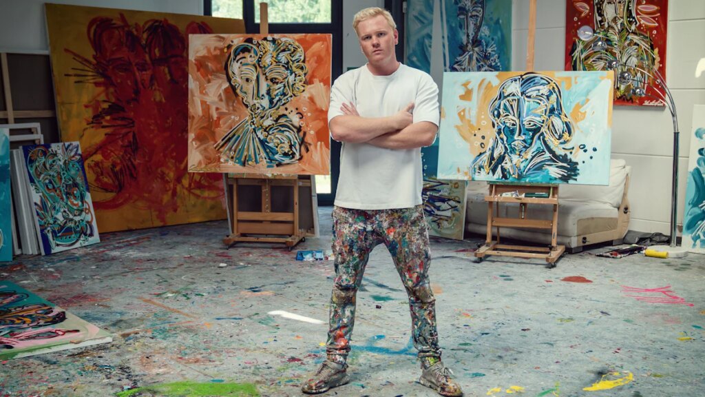 Schnell zeigt der Film, dass Löwentraut zumindest genial darin ist, jedes erdenkliche Pseudo-Künstler-Klischee traumwandlerisch sicher zu bedienen: Denn natürlich verarbeite er in seiner Kunst den Schmerz, den er erfahren hat. Die Abende, die er allein in Hotelzimmern verbringt, seien hart. Zu den Rockstar-Floskeln kommt dann auch eine gehörige Portion Großspurigkeit hinzu. „Ich habe die Kunst neu definiert“, sagt Löwentraut. Er kündigt an, dass er mit seinen Werken in die Kunstgeschichte eingehen möchte.