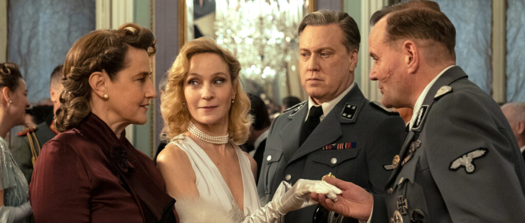 Der frei erfundene Vierteiler geht also eine Art fiktionalen Sonderweg. Wie 1997 Max Färberböcks lesbisches Kriegsmelodram „Aimée & Jaguar“, 20 Jahre später „Babylon Berlin“ oder zwischendurch Jonathan Littells Tatsachenroman „Die Wohlgesinnten“ aus dem Alltag eines SS-Offiziers, benutzt Drehbuchautor Holger Karten Schmidt den Faschismus als Fototapete regimeferner Erzählungen. Und die versieht Christopher Schier mit einer Vielzahl imposanter Hakenkreuzfahnen; nur dekorieren sie eher einen Krimi im als über Besatzungsterror.