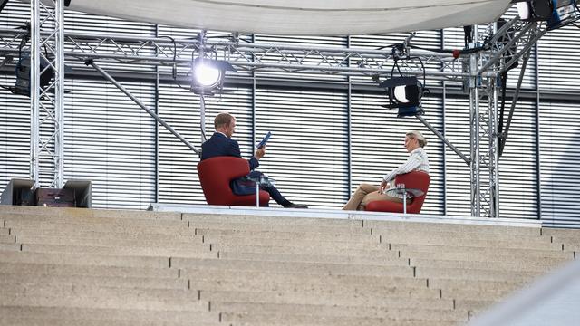 Das am Sonntagnachmittag live im Internet übertragene Interview wurde im Berliner Regierungsviertel an der Spree unter freiem Himmel geführt. Eine Demonstration am anderen Spreeufer mit Trillerpfeifen, Hupen und lauter Musik mit Anti-AfD-Slogans war in der Übertragung deutlich zu hören.
