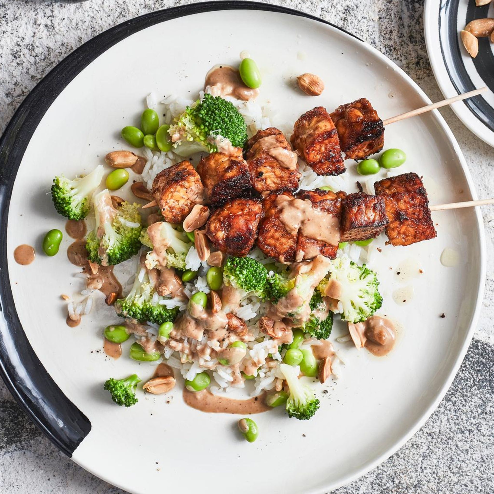Rein pflanzlich und super lecker: Gebratener Tempeh, knackiger Brokkoli und Edamame in Kombination mit Reis und cremiger Erdnusssoße sind fix aufgetischt.