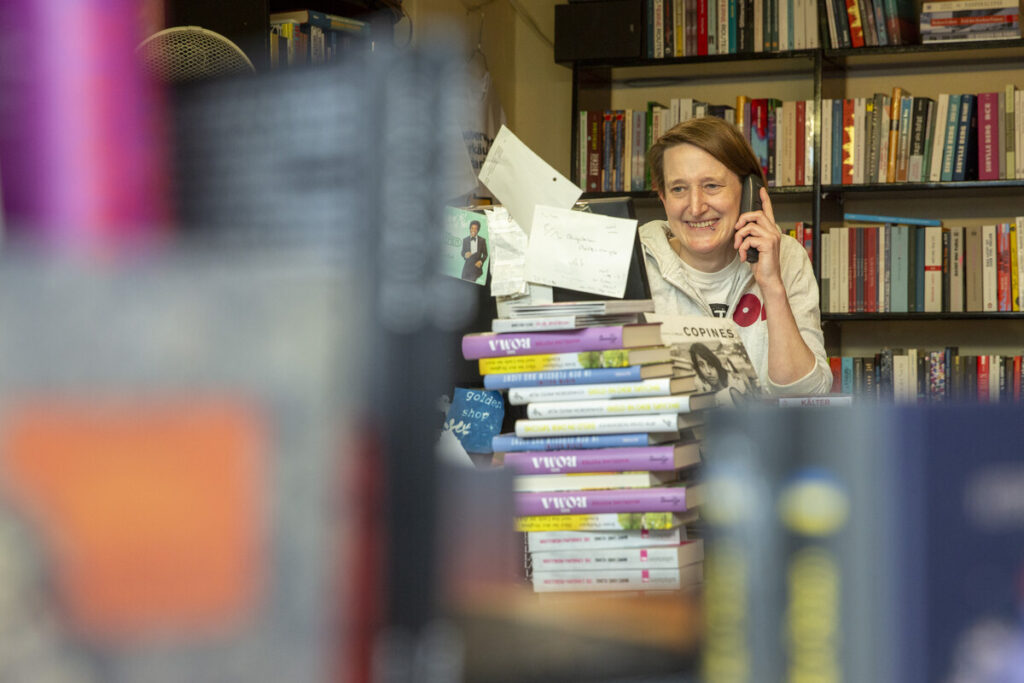 Der Golden Shop ist eine dieser drei Buchhandlungen. Ein 24 Quadratmeter kleiner Raum, Holzdielen, vollgestapelte Büchertische. Wer die knarzende Treppe hochgeht, kommt in einen weiteren, genauso kleinen Raum mit Platten, Graphic Novels, Zines, aber so weit kommt die ältere Kundin heute gar nicht. Sie wird schon unten fündig, kauft ein Buch von Marc-Uwe Kling und geht wieder.