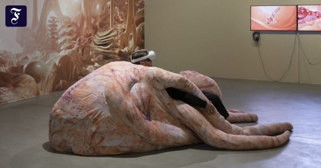 Betrachten lässt sich das mit dem distanzierten Blick eines Bio-Ingenieurs. Die meisten Arbeiten setzen dagegen auf Immersion und Einfühlung. Wie in einem Sitzsack plumpst man auf die mit Krakenarmen versehene Stoffskulptur von Isabell Bullerschens „Ipseria“ (2022), setzt sich eine Virtual-Reality-Brille auf und wird multisensorisch – das Möbel vibriert – mit fiktiven Mikroorganismen eine Speiseröhre hinabgespült. Das soll durch Anverwandlung an eine fluide Lebensform die Verbindung zur eigenen Körperlichkeit stärken.