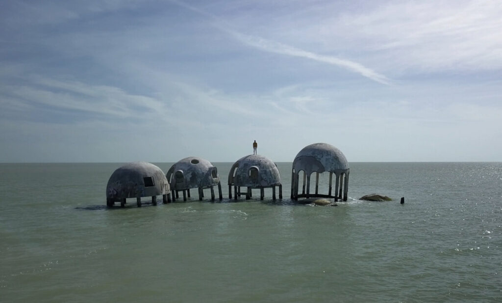 Im Film sieht man, wie ein Luxusresort an Floridas Küste, eine Reihe von Kuppelbauten aus den 1980er Jahren, heute zur Ruine geworden im Meer steht. Kormorane und andere Vögel leben nun hier. Keine Katastrophenstimmung unterliegt diesen Bildern in „Reenactment for a Future Scenario no.2: Cape Romano“, sondern mehr eine friedliche Beobachtung der neuen Bewohner. Die Skulpturen sind Büsten von Faithfulls eigenem Kopf, bewohnbar gemacht für Pilze und Bienen.