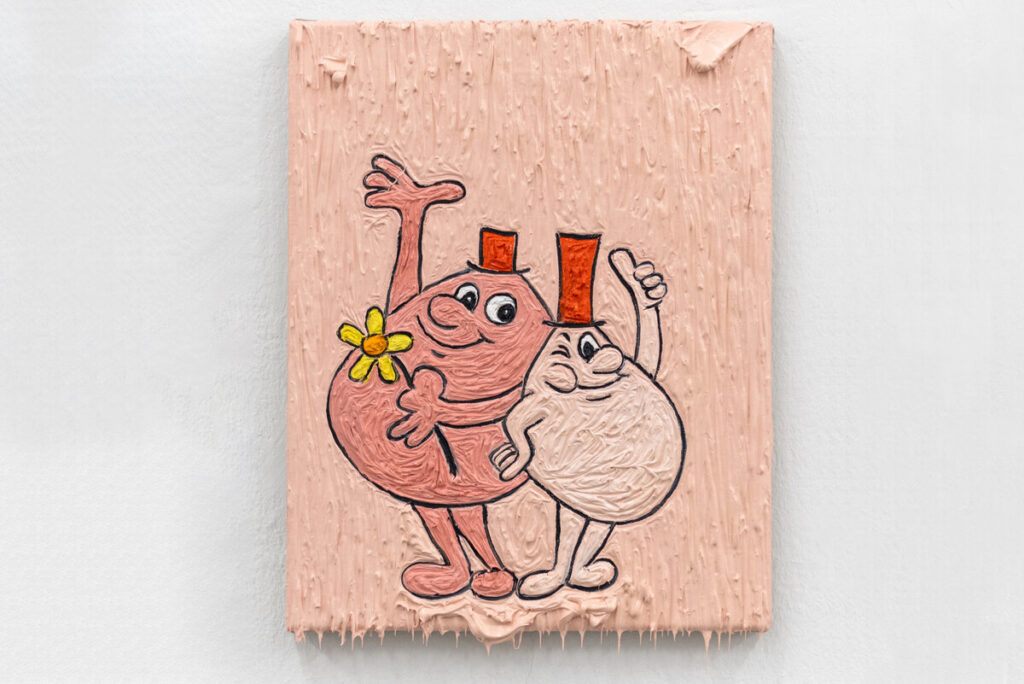„Ohne Titel (HubbaBubba)“ heißt die Arbeit von 2023, die nur Titel und die Motivlage mit dem klebrigen Lebensmittel teilt. Auf dem pastosen Untergrund, tatsächlich reine Ölfarbe, hat die Künstlerin jene kugelrunden Kaugummiblasen platziert, mit denen der Hersteller einst geworben hat.