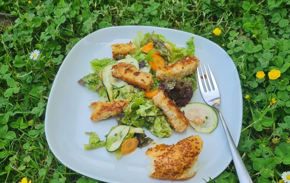 Das Rezept bleibt das gleiche: Salat mischen mit dem, was gerade an Gemüse und frischen Kräutern da ist. Eine leckere Vinaigrette dazu und frisch angebratenes Geflügel.