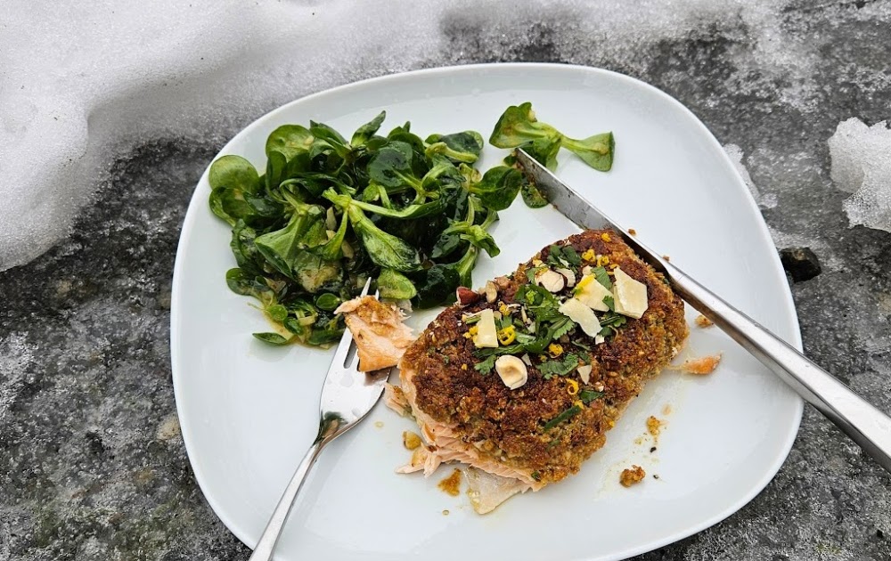 Den Lachs auf (vorgewärmte) Teller verteilen. Dazu passt ein winterlicher Salat (wir hatten Feldsalat) und eine Scheibe Brot. Die Kruste, die vom Lachs herunter auf den Boden der Form gerutscht ist, kann man mit etwas Brot auftunken.