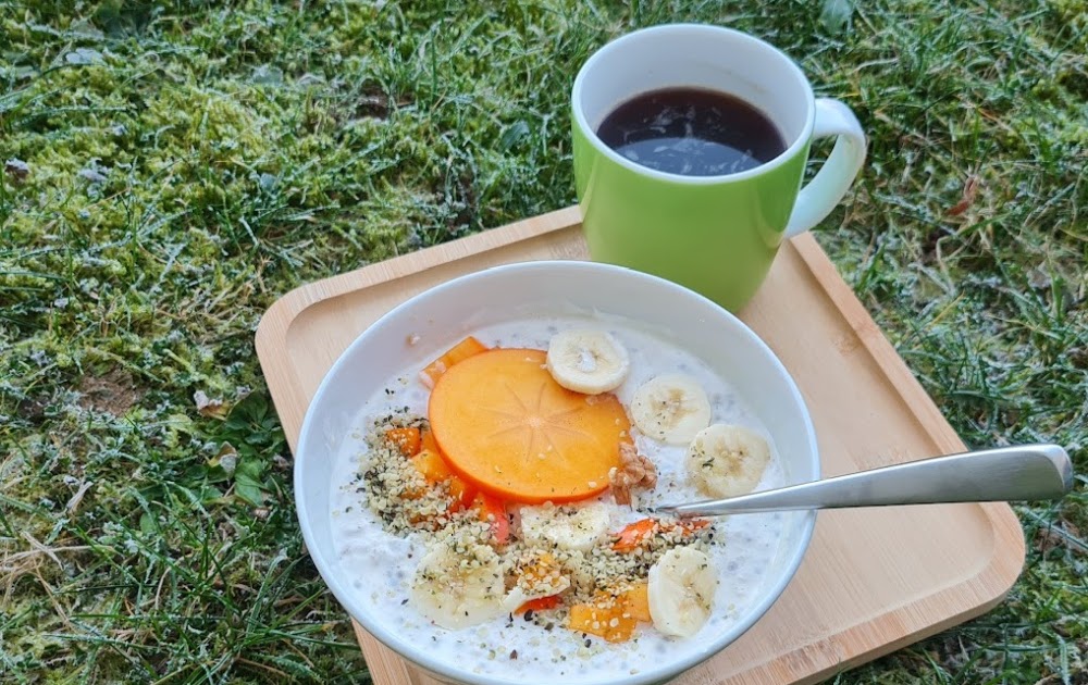 Farbe, Geschmack und winterlichen Touch geben eine Kaki und eine Banane, die es in dieser Jahreszeit in guter Qualität zu kaufen gibt.