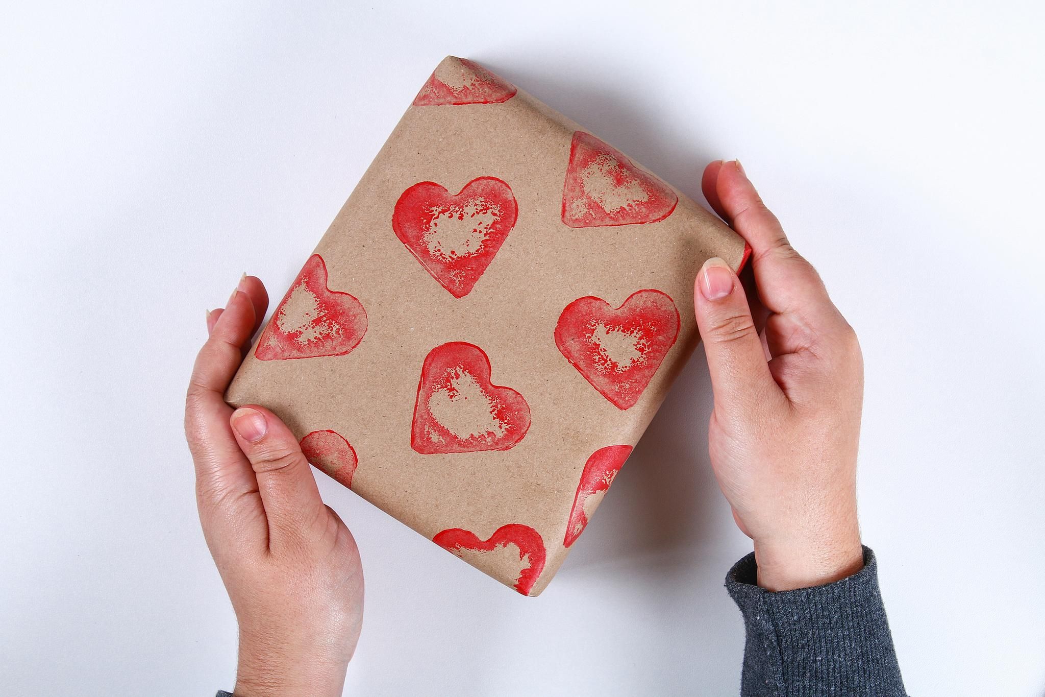 Du möchtest deinem Schatz als Geschenk Pralinen selber machen? Süße Idee! Mit Kartoffeldruck bekommt auch die Pralinenschachtel ein angemessenes Gewand.