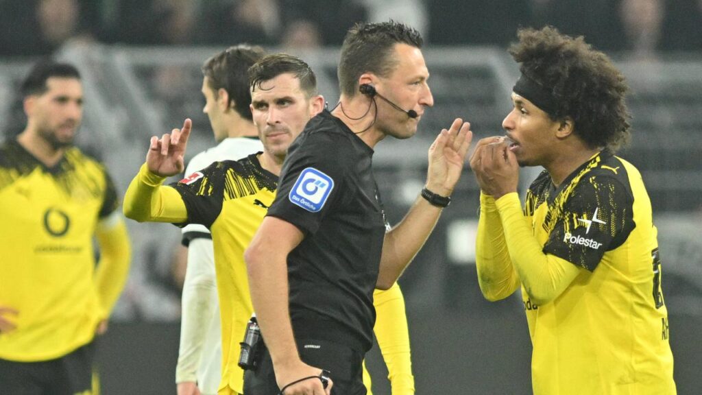 Dortmunds Karim Adeyemi (r.) diskutiert mit Schiedsrichter Sven Jablonski