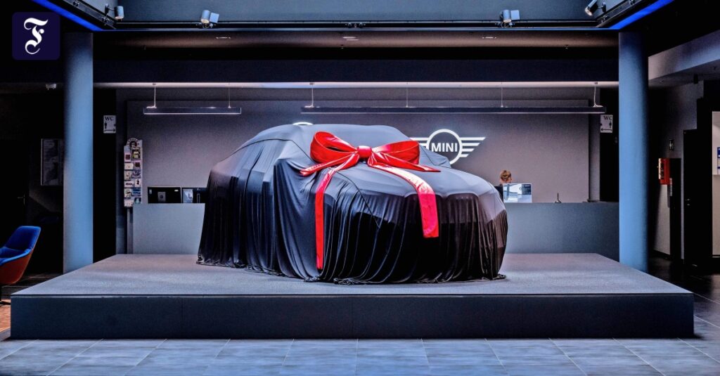 Durch den hellen Vorhang schimmert es schon durch, das Objekt der Begierde. Musik erklingt, mit einem Beamer wird der Name des Kunden auf den Stoff projiziert, dann werden nacheinander die Zahlen von zehn bis eins eingeblendet – nach Abschluss des Countdowns öffnet sich der Vorhang und legt den Blick auf einen hellblauen Mini frei.
