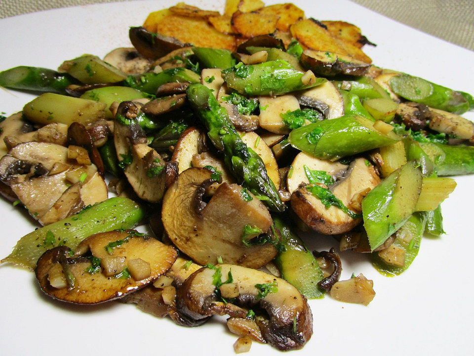 Wieder etwas Kokosöl in der Pfanne erhitzen, den Knoblauch und den Spargel dazugeben und ca. 5 Min. braten, bis der Knoblauch anfängt Farbe zu nehmen, jetzt kommt ganz wenig Wasser dazu und der Deckel auf die Pfanne. Etwa weitere 5 – 10 Minuten dünsten, bis der Spargel bissfest ist. Nun die Pilze wieder dazugeben und alles zusammen noch einmal kurz durchschmoren. Mit Kräutersalz und Pfeffer abschmecken, die Petersilie unterrühren und servieren.