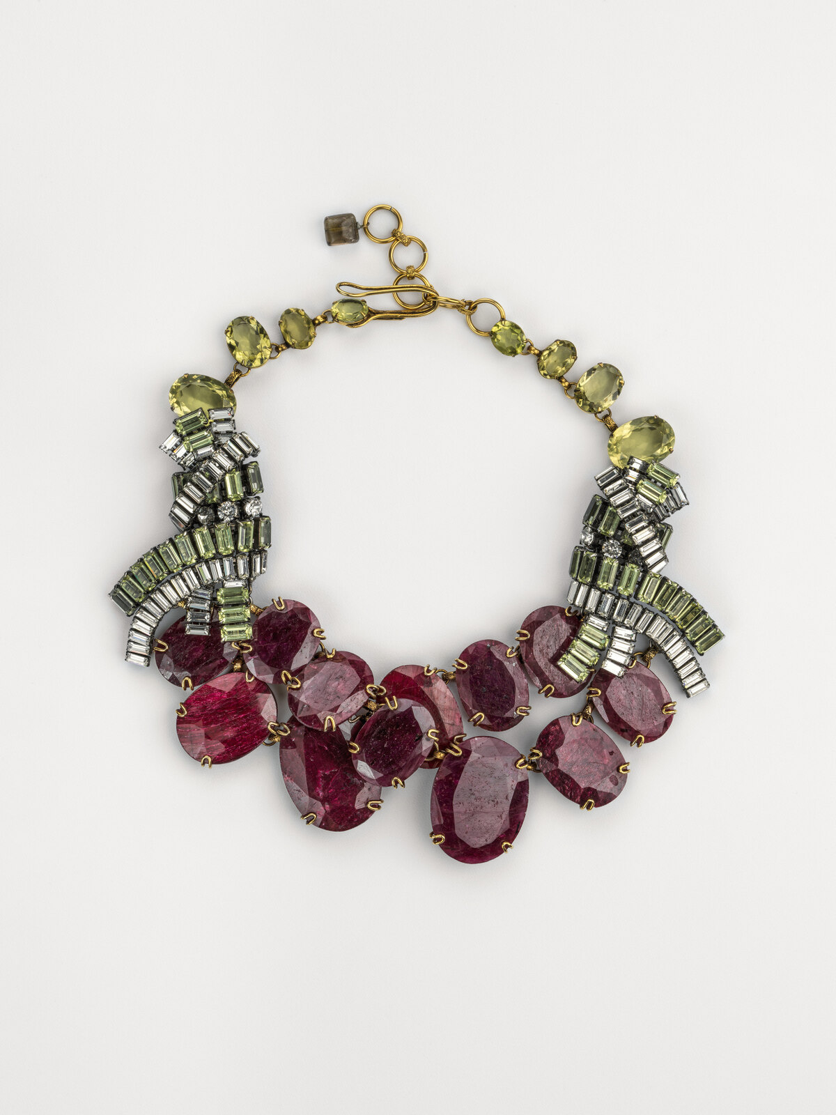 Die Kette von Iradj Moini besteht aus prächtigen Rubinen und Citrinen, die von vergoldetem Messing eingefasst sind