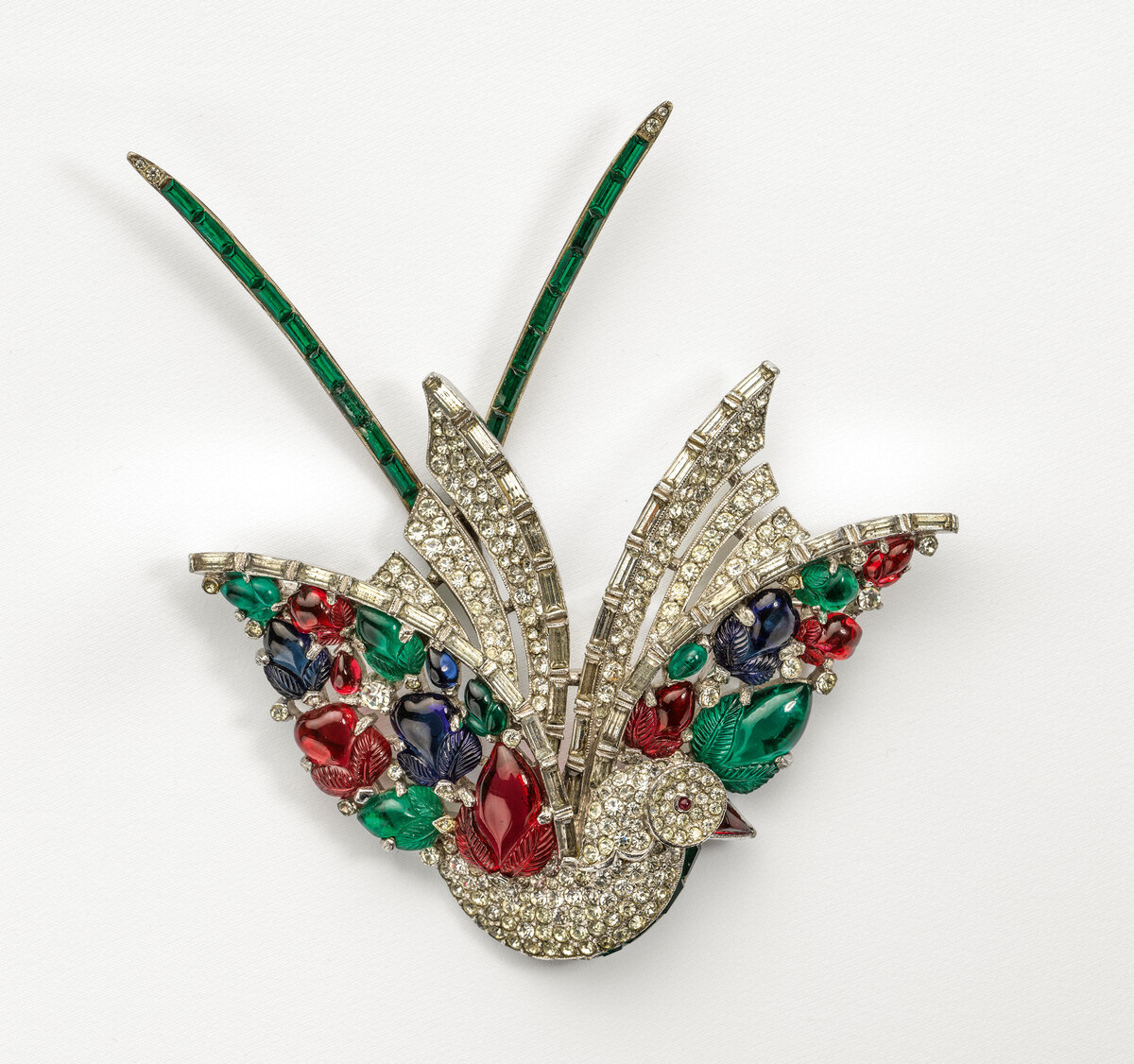 Die Flügel dieses niedlichen Vogelansteckers von Trifari sind mit farbigen Glassteinchen besetzt