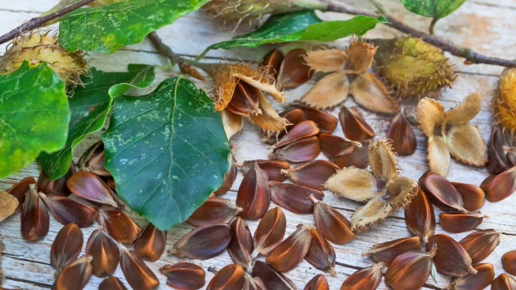 Bucheckern und Buchenblätter liegen auf einem Holztisch. | picture alliance / blickwinkel, F. Hecker