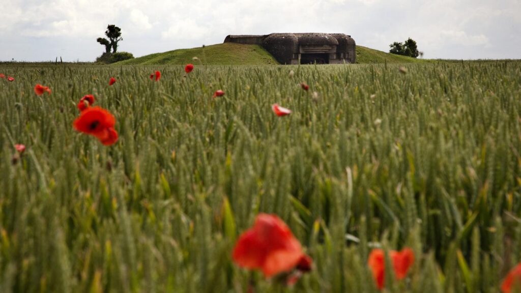 Mohnblumen wachsen auf einem Feld rund um einen deutschen Bunker aus dem Zweiten Weltkrieg.