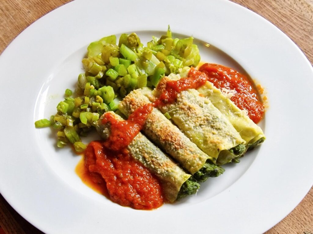 Cannelloni unter Grill/UL bei 220°C leicht anbräunen und mit dem Gemüse und dem Tomatensugo servieren.
