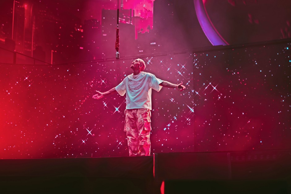 Der Popstar erhebt sich – wortwörtlich. Während „Wall to Wall“ schwebt er auf einer Seilbahn über die Menge hinweg zur B-Stage. Dort steht eine rote Chaiselongue. „Möchte eine Dame auf die Bühne kommen?“, fragt er. Ein Fan wird ausgewählt, Chris Brown singt für sie „Take You Down“, beginnt einen Lapdance. Die Menge schreit und feiert das – denn Brown bedient die Phantasien vieler, und das weiß er, inszeniert diesen Teil der Show als sexy Verführung mit lasziven Bewegungen. Bis mit „Feel Something“ Sänger und Tänzerinnen in einem einzigen, pulsierenden Körper verschwimmen.