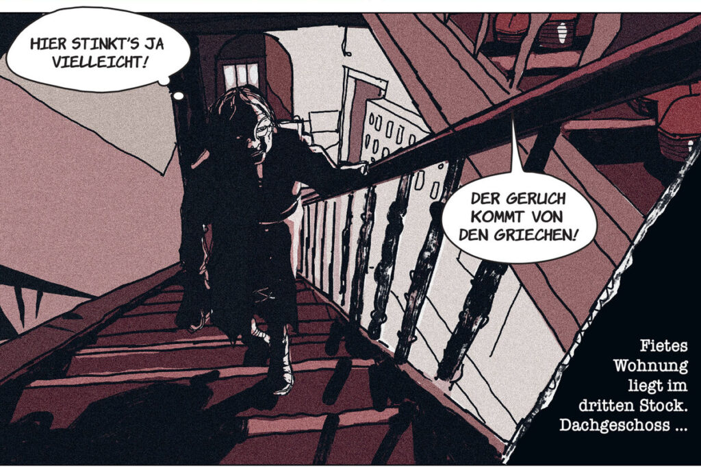 In Rottöne getaucht, werden die verlorenen Romangestalten vorgestellt; vor sich hin dämmernde „Schimmlige“, der Lude Fanta-Rolf mit Goldkettchen, Soldaten-Norbert von der Waffen-SS, dessen Physiognomie einer Muräne ähnelt. Hier schleppt Fiete die Frauen ab, die er kriegen kann. Gerda kommt mit, zu Fuß durch den Schnee, die Treppe hoch in seine Dachgeschosswohnung in Altona.