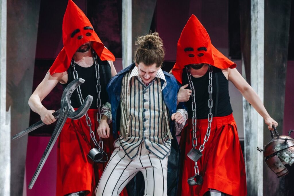 Die Inszenierung der Regisseurin Brigitte Dethier und die Kostüme von Carolin Mittler charakterisieren die Figuren ratzfatz, da bleibt kein Zweifel. Das Kleid der Hofdame Knochen ist um die Knöchel so eng, dass sie nur mit Tippelschritten gehen kann, bedrohlich schwanken ihr Haarturm und ihre Sopranstimme (Alexandra Oomens) sticht wie ein Speer in die Luft.