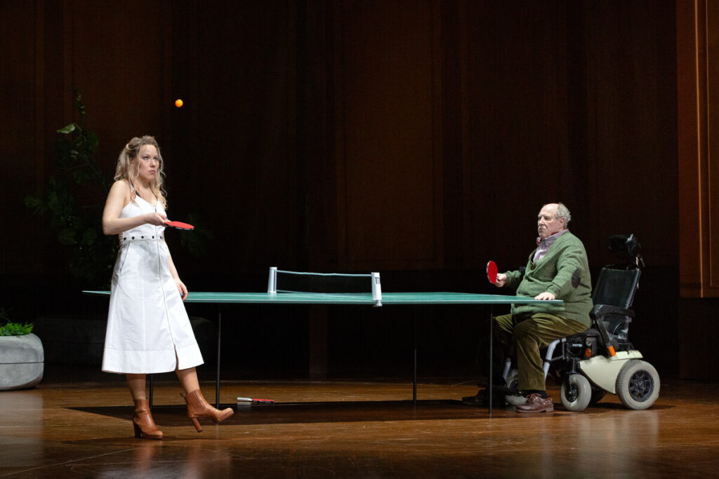 Ross‘ Inszenierung funkelt durch das wirklich fantastische Ensemble. Doch in diesem Strahlen übersieht man leicht die technische Konstruktion vieler Szenen: den Rundlauf um die Tischtennisplatte, das „War hat Angst vor … “-Spiel, das Karaoke-Singen und das stückimmanente Bingo am Schluss. Figurenentwicklungen gehen dabei verloren, genauso wie nachvollziehbare Binnenbeziehungen, Fallhöhen oder Spannungsbögen.