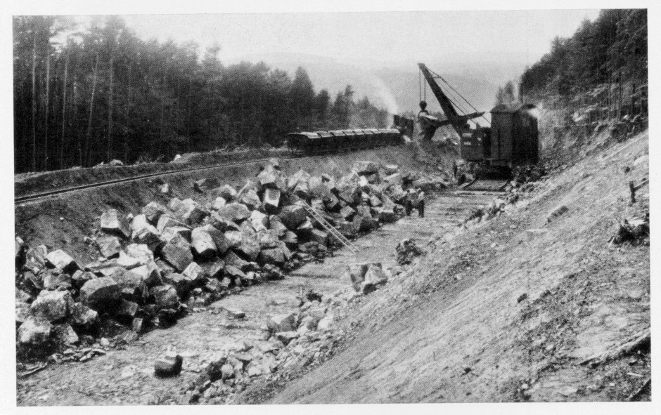 Autobahnbaustelle 1939: Züge bringen das Material, ein Dampfbagger buddelt den Hang weg.Fotos: Bildarchiv Dieter Stockmann