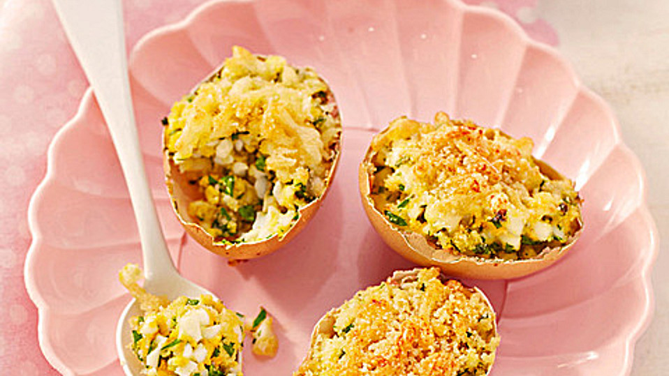 Eigelb und Eiweiß aus den Schalen lösen. Eigelb am besten durch ein Sieb streichen oder mit einer Gabel zerquetschen. Eiweiß sehr fein würfeln. Beides mit den Kräutern und 40 g der Butter vermischen. Mit Salz und Pfeffer abschmecken. Masse in die Eierschalen füllen. Semmelbrösel und Käse mischen, darüber streuen. Die restliche Butter zerlassen und darüber träufeln.