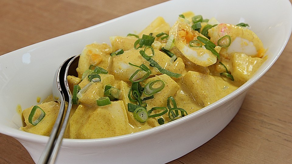Ananas schälen, vierteln, Strunk entfernen, nochmals halbieren und in Würfel schneiden. Zwiebellauch putzen, waschen und in feine Ringe schneiden. Eier pellen, abwaschen und vierteln. Eier und Ananas vorsichtig vermengen, die Curry-Mayonnaise zufügen und vorsichtig unterheben.