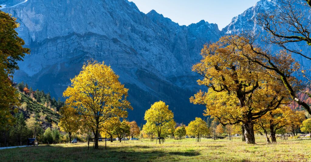 Im Herbst verwandelt sich der Große Ahornboden in Tirol für kurze Zeit in ein gelbrotes Feuerwerk. Das hat sich längst herumgesprochen. Schön ist es trotzdem.