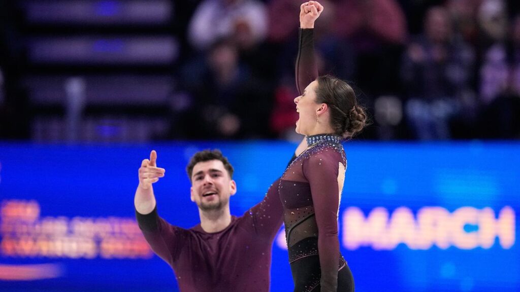 Das Eiskunstlaufpaar Annika Hocke und Robert Kunkel jubelt nach der Kür bei der WM in Prag (Quelle: picture alliance / ASSOCIATED PRESS | Petr David Josek)