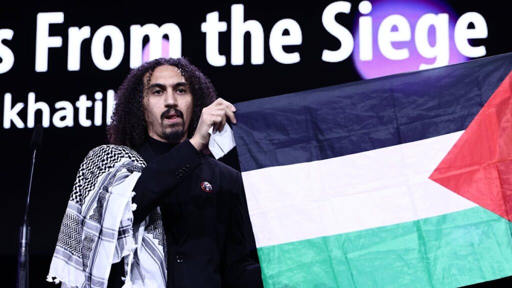 Alkhatib, der eine palästinensische Flagge mit auf die Bühne brachte, sagte, eines Tages werde es ein wunderbares Filmfestival in Gaza geben. „Wir werden uns an jeden erinnern, der an unserer Seite stand, und wir werden uns an jeden erinnern, der gegen uns war“, sagte er. „Ein freies Palästina von jetzt bis ans Ende der Welt.“ Im Saal waren Applaus und auch Zwischenrufe zu hören.