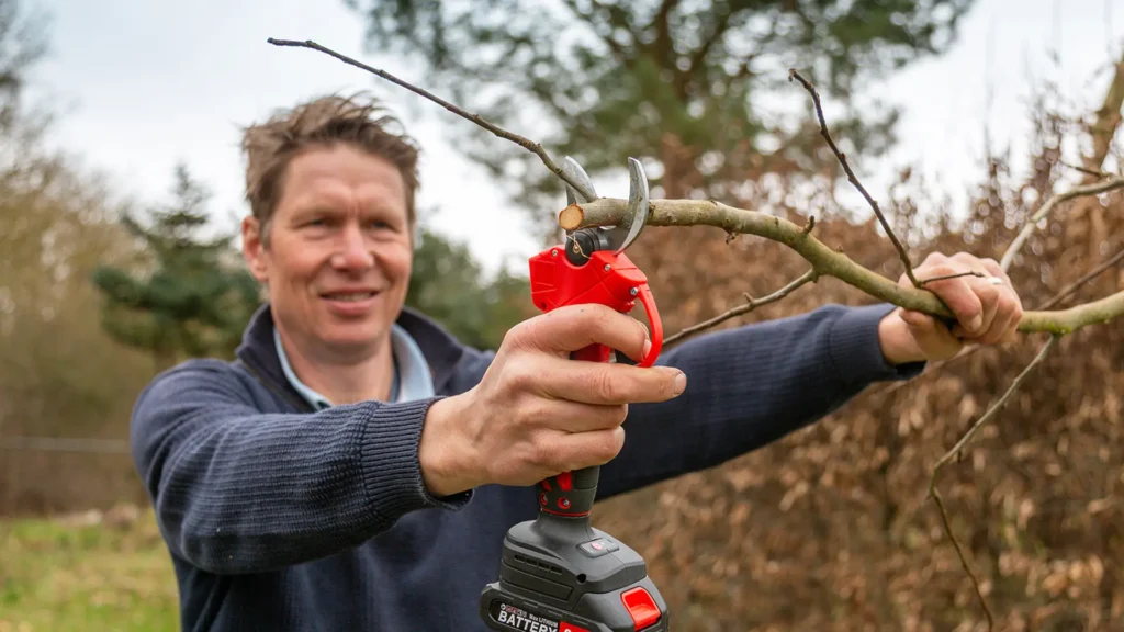 Gärtner Peter Rasch schneidet mit einer Akku-Gartenschere eine Ast ab. | NDR, Udo Tanske
