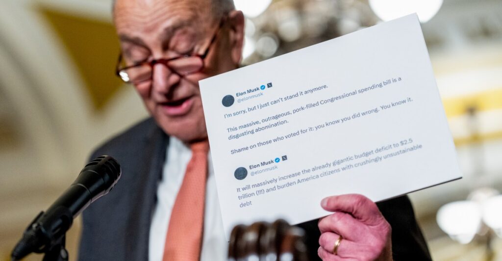 Democrats had a different response, as ABC News reports that Senate Minority Leader Chuck Schumer held up a printout of Musk’s tweets during his press conference following a policy luncheon. Schumer told reporters, “Trump’s buddy says the bill is bad — you can imagine how bad this bill is,” while his counterpart in the House, Hakeem Jeffries, said, “…breaking news: Elon Musk and I agree with each other.”