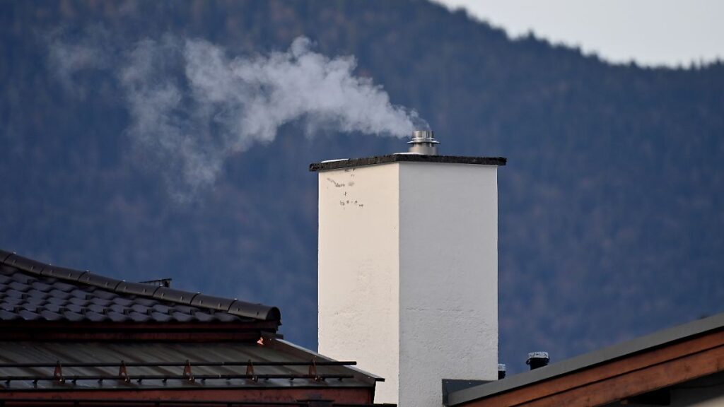 Rauch-tritt-aus-einem-Schornstein-einer-Oelheizung-Gasheizung-Qualm-Schornstein-CO2-Kohlendioxid-Feinstaub-Ausstoss-Treibhausgase-Umweltverschmutzung-Luftverschmutzung-Erderwaermung-Klimawandel