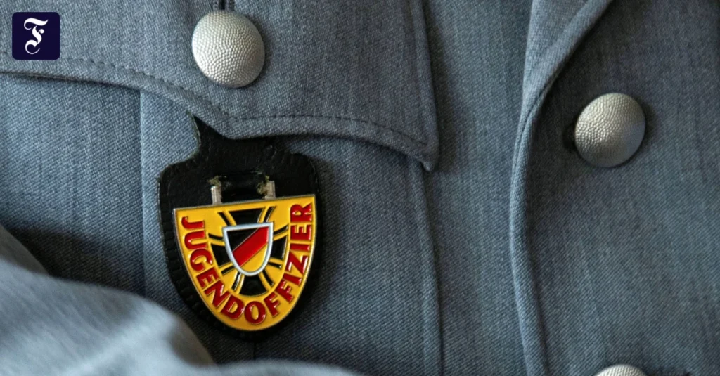 Ein Bundeswehrsoldat trägt ein Abzeichen mit der Aufschrift „Jugendoffizier“ an der Brusttasche.dpa