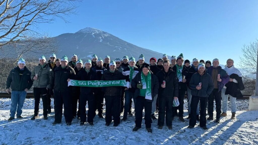 „Ochsentour 2026 – ziiieeehhh das Bier ab“ heißt das diesjährige Motto. Sie tragen grün-weiße Zipfelmützen, grün-weiße Schals, abends zum gemeinsamen Essen ein weißes Hemd, dazu grün-weiße Krawatte. Eine grün-weiße Fahne haben sie natürlich auch. Martin Schmitt, Sven Hannawald, Adam Malysz, alle haben sie dort ihr Autogramm hinterlassen. Den Finnen Matti Hautamäki haben sie auch noch erlebt. Und die Deutschen, aktuell? „Ich hoffe, dass Geiger und Wellinger bis Olympia wieder in die Spur finden“, sagt Perlbachtal-Sprecher Stefan Mäurer. Begeistert sind die Fußballer von Philipp Raimund und Felix Hoffmann. Aber den zurückgetreten Markus Eisenbichler mochten sie am liebsten, „weil er so authentisch ist“.