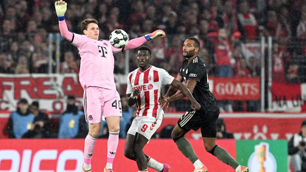 Für Jonas Urbig waren die Gefahren noch nicht überstanden, als der 4:1-Sieg des FC Bayern beim 1. FC Köln längst in die Chronik des DFB-Pokals eingegangen war. Der 22 Jahre alte Torhüter musste noch den Interviewparcours absolvieren, und dort ging es teilweise bedrohlich zu. Unter den Zuhörern wurde gedrängelt und geschoben, als ob es Freibier gäbe, und wenn Urbig nicht aufgepasst hätte, dann hätten ihm die eifrigen Leute vom Klub-TV das Mikrofon ins Gesicht gerammt. Lächelnd parierte er auch diese Attacke.