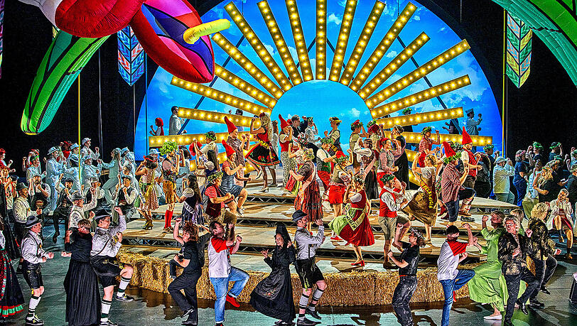 Das Bühnenbild überrascht anfangs mit einer steilen Treppe zu einem Bergkirchlein, die Meistersinger tagen in Elementen des Festspielhauses. Der zweite Akt und die Schusterstube schauen wie üblich aus, die Festwiese erinnert mit einer großen, aufblasbaren Kuh (Bühne: Andrew D. Edwards) an eine alpine Landwirtschaftsmesse.