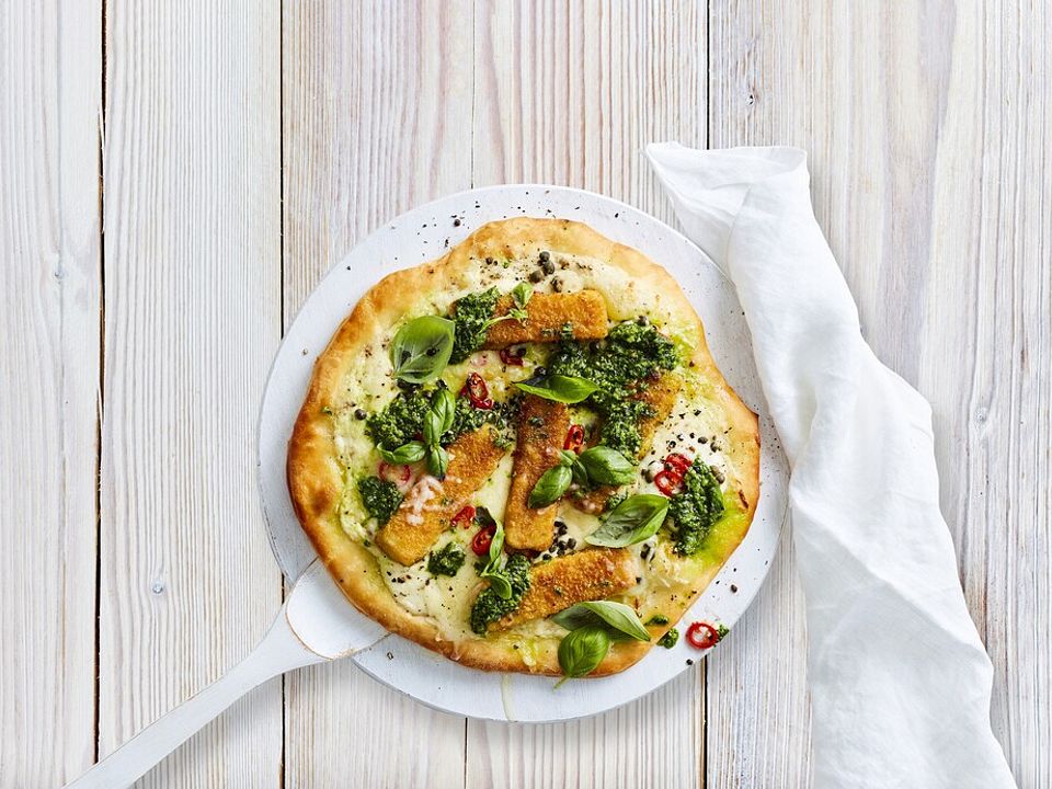 Den Pizzateig auf einem Blech gleichmäßig ausrollen und mit dem Bärlauchpesto bestreichen. Nun die Pizza mit Fischstäbchen, Kapern und Chili belegen. Abschließend den Belag mit dem Pizzakäse bestreuen und die Pizza im Ofen bei 200 °C Umluft 10 – 15 Minuten backen.
