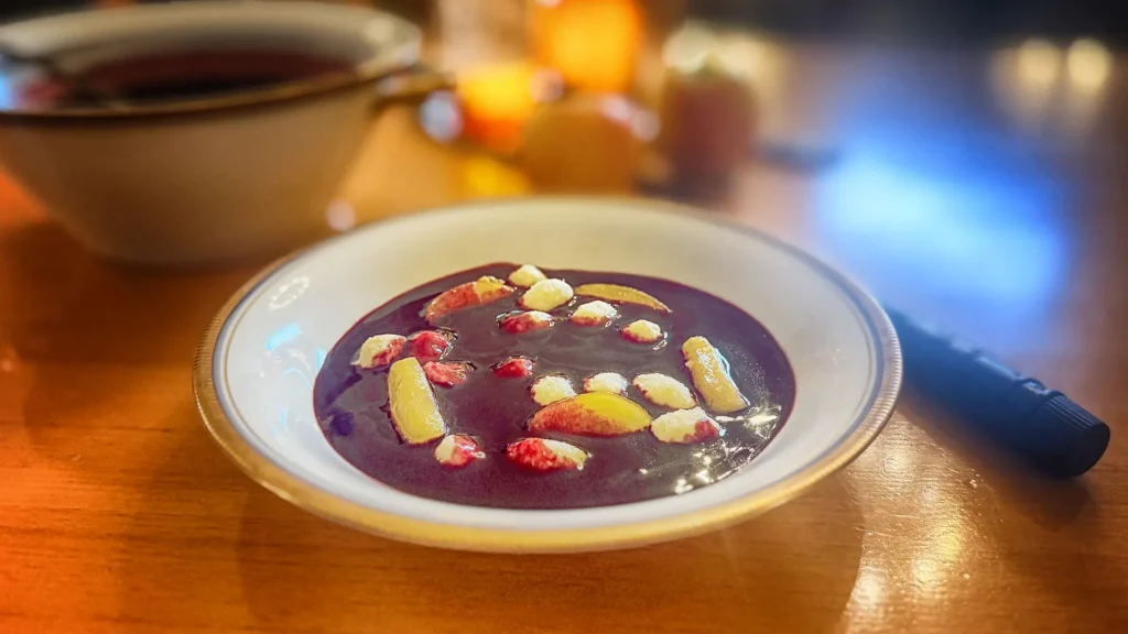 Fliederbeersüppchen mit Apfel und Grießklößchen auf einem weißen Teller serviert | NDR
