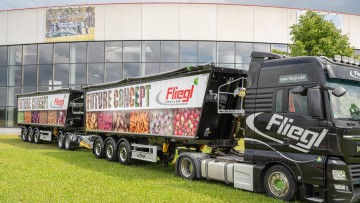 Wie kommen Mais, Rüben oder Häckselware besonders wirtschaftlich vom Feld? Fliegl hat dafür das Future-Concept auf die Räder gestellt. Dieses präsentiert der Thüringer Trailer-Spezialist auf der Landwirtschafts-Messe „Agritechnica“, die vom 9. bis zum 15. November auf dem Messegelände in Hannover stattfindet. Das „Future-Concept“ besteht aus zwei, per hauseigenem Dolly hintereinander gekoppelten, Dreiachs-Sattelaufliegern vom Typ „DHKA 390“. Zwei mal 50 Kubikmeter Ladekapazität kommen zu zusammen. Und dank der Leichtbauweise der ausgestellten Greenline-Varianten bringt jeder der beiden Trailer laut Fliegl lediglich 5,8 Tonnen auf die Waage.