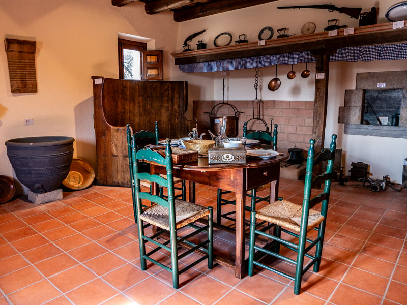 Am Eingang erwartet mich Mireia, die gute Seele des Museums, die mich durch die einzelnen Räume führt und mir die Geschichte des Dorfes erklärt. Als Erstes betreten wir die wunderschön mit alten Möbeln nachgebaute Küche. Über der Feuerstelle hängt ein Kessel mit heißem Wasser, davor steht eine halbrunde Bank mit einer hohen Rückenlehne. Alle Möbel stammen aus alten Masias und sind hier mehr oder weniger vor dem Vergessen gerettet worden. Mireia erklärt, dass der Hof, der hier nachgebaut wurde, keine arme Bauernkate aus der Zeit des Mittelalters sei. Vielmehr habe man ein wohlhabendes Landgut aus dem 17./18. Jahrhundert nachgestellt.