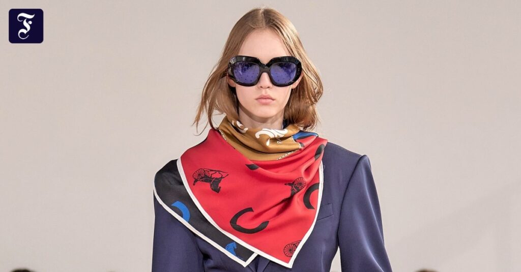 Ich selbst begnüge mich meistens mit einem einfachen Knoten. Der kann vorn oder hinten getragen werden – Pfadfinder oder Wilder Westen. Der neue Kreativdirektor von Celine, Michael Rider, hat zu seinem Debüt vor einigen Wochen gezeigt, auf welch vielseitige Weise sich ein Tuch drapieren lässt. Er schichtete die Tücher über den Mantel, servierte sie plusterig unter dem Kragen oder ließ sie locker über das Hemd fallen. Das Tuch ist also noch lange nicht auserzählt.